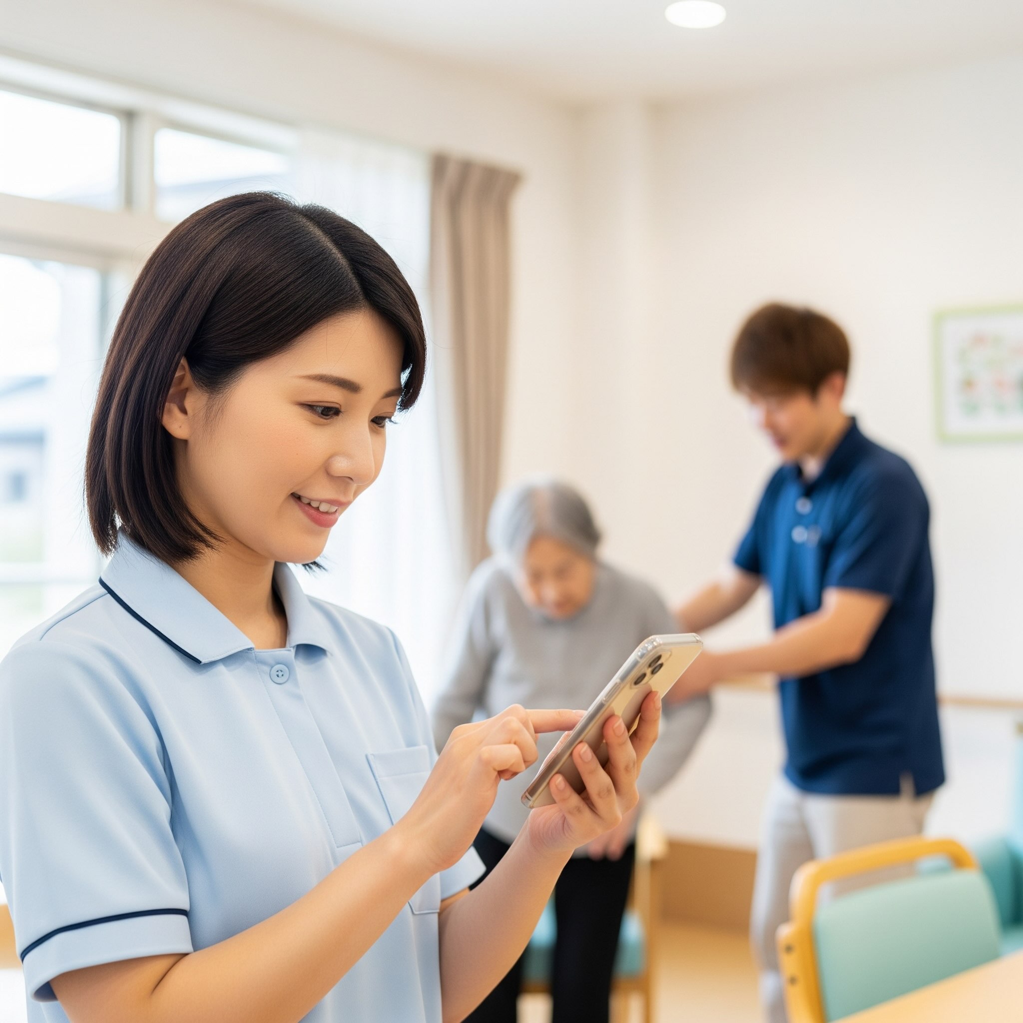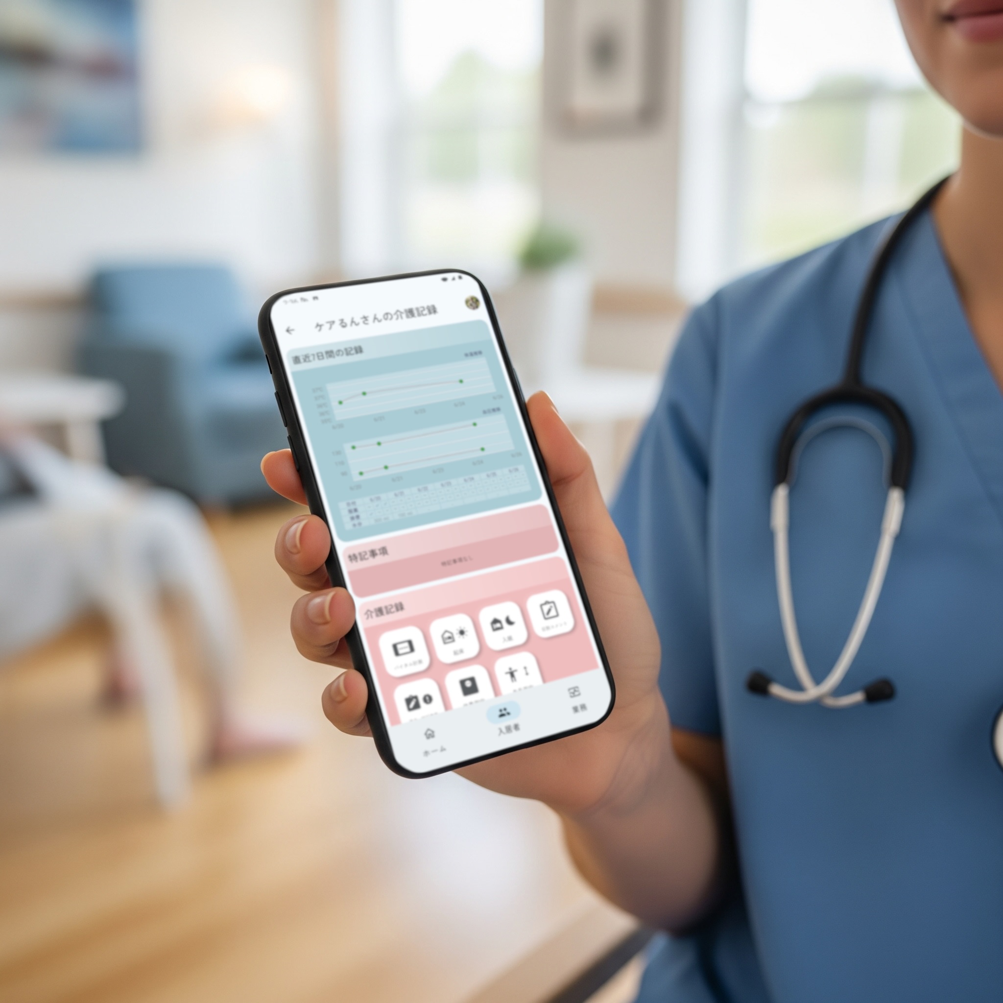 手書きの煩わしさから解放。スマホでタップするだけで記録完了。食事・入浴・服薬・バイタルサインなど、すべてのケア記録を一つのアプリで管理。記録漏れを防ぐアラート機能で安心。複数の書類への重複記入が不要に。引き継ぎ時の情報共有がスムーズ。外出先からでも記録・確認が可能。